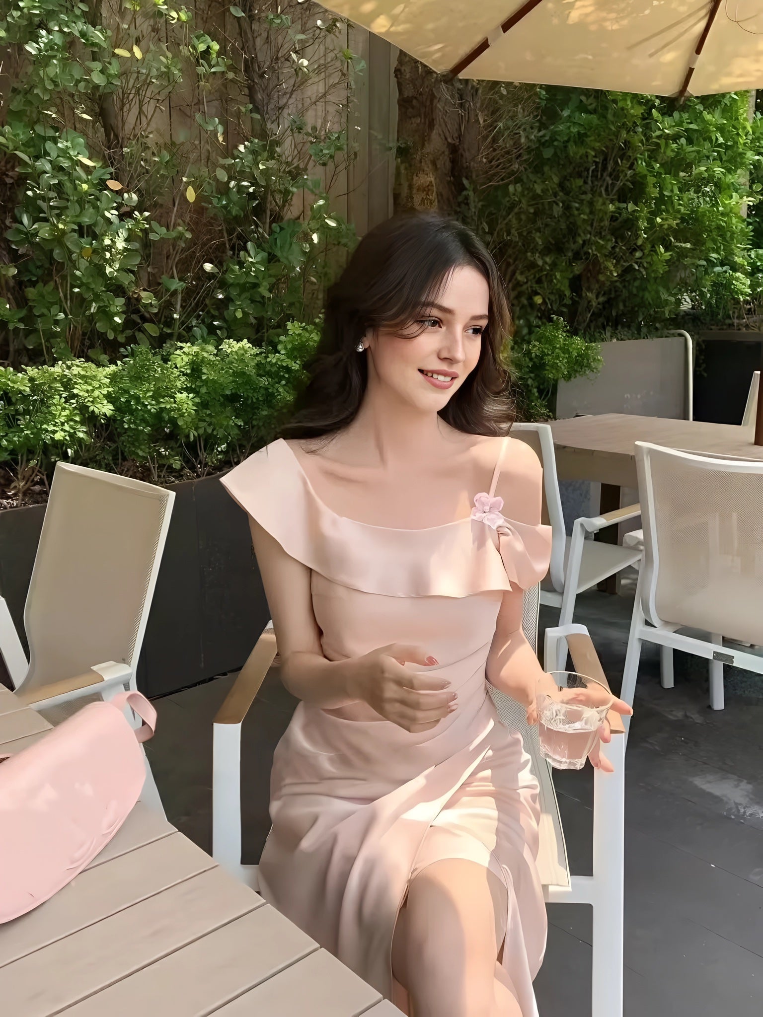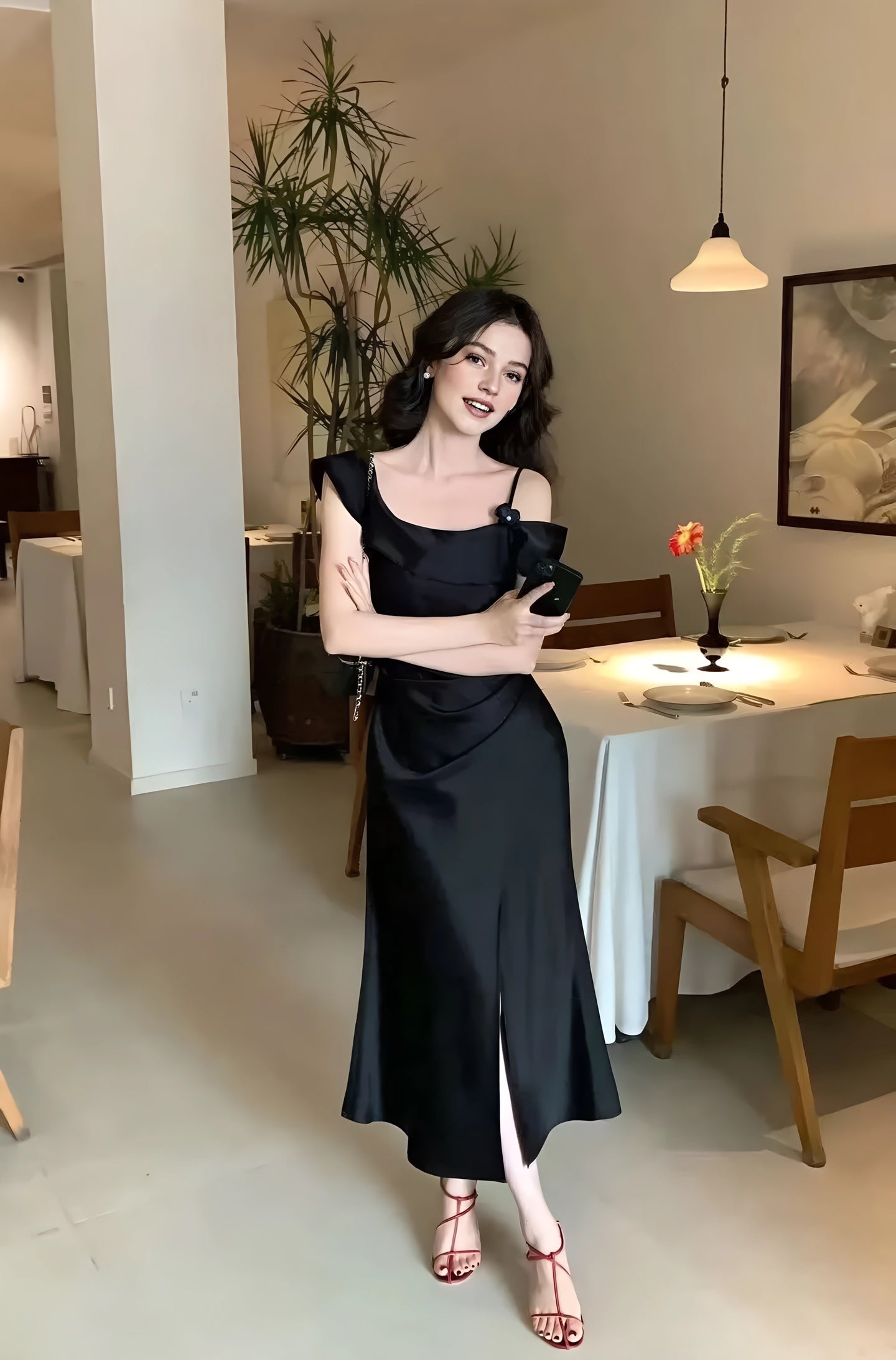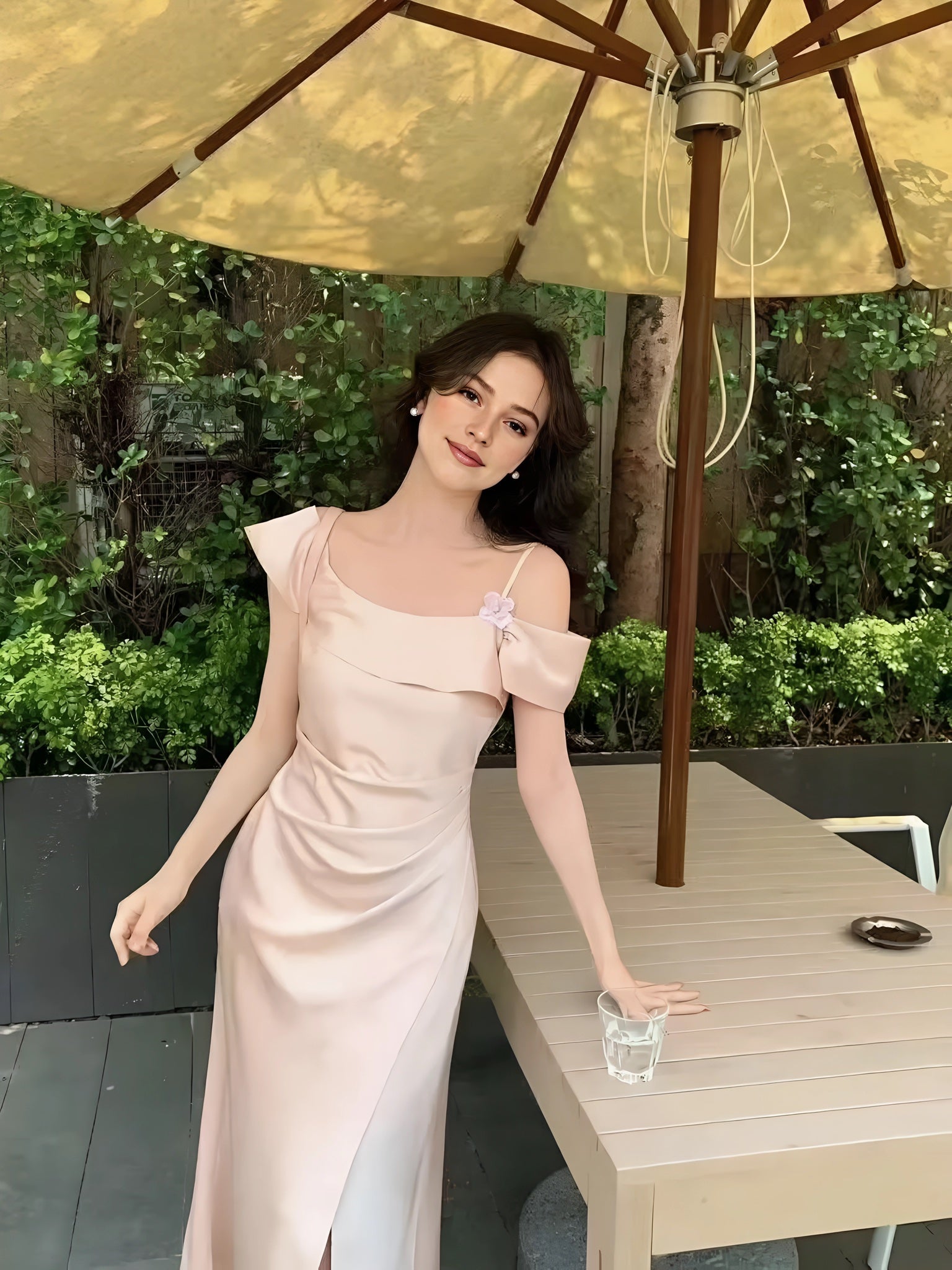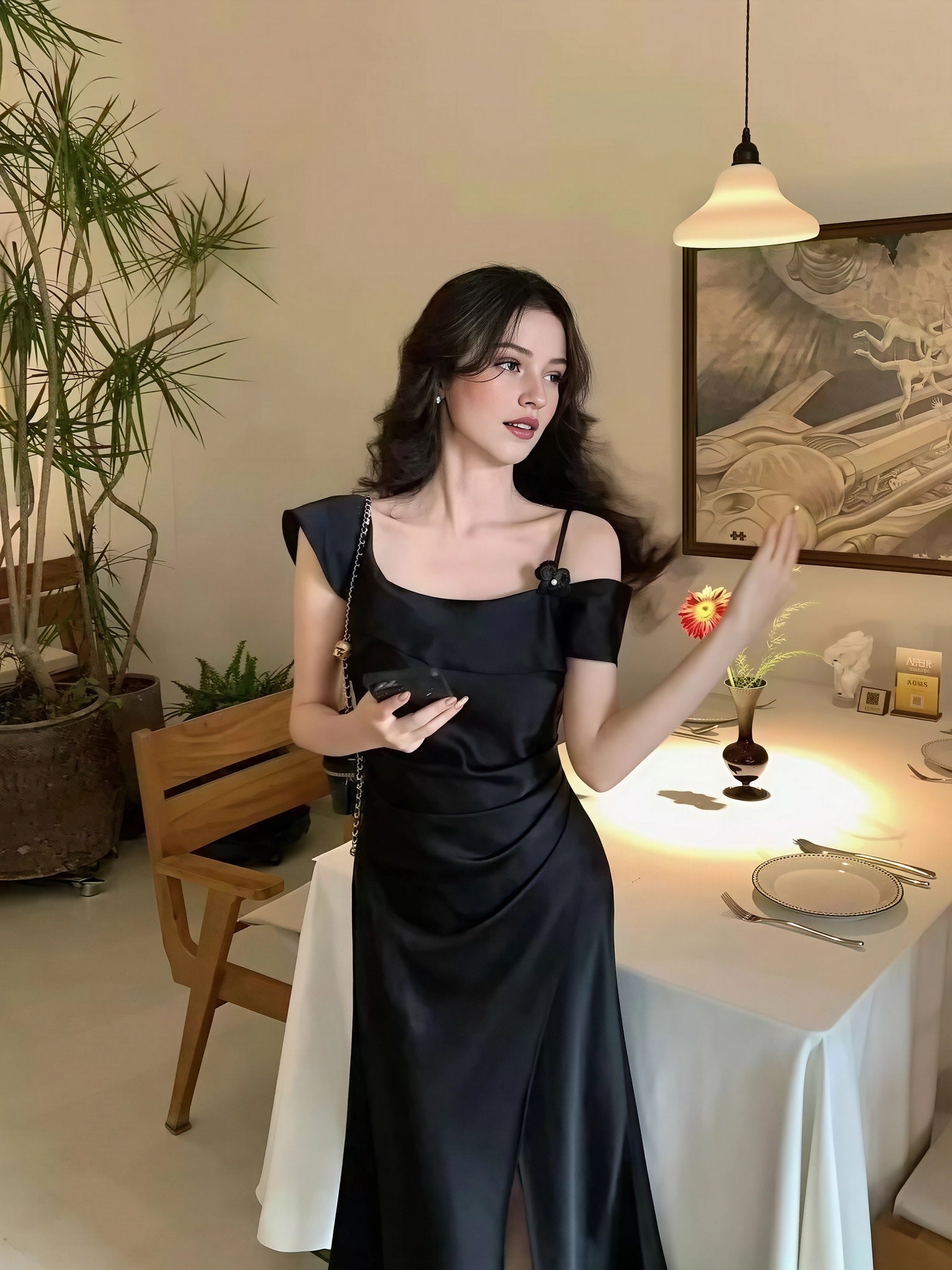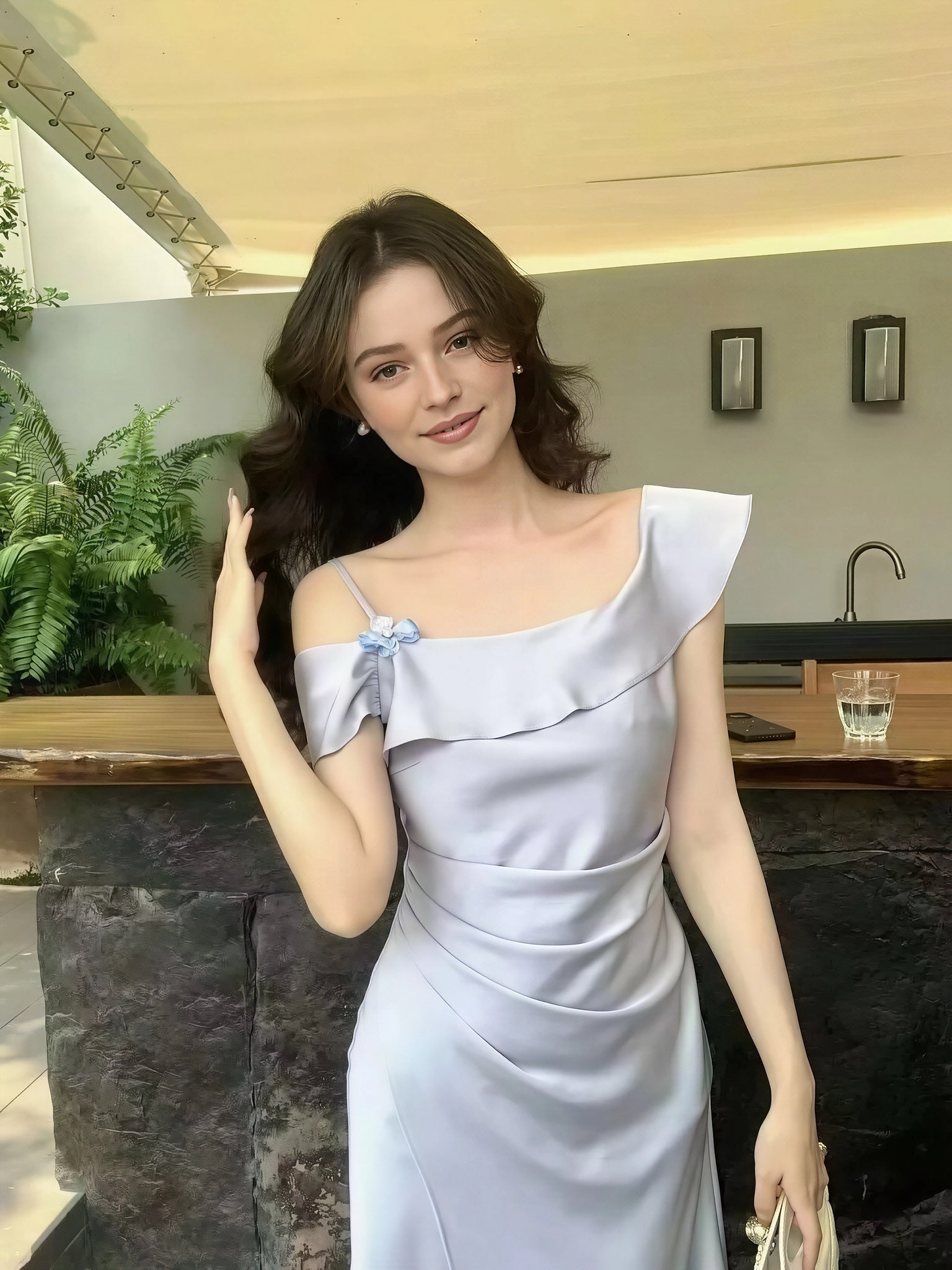 This off-shoulder gown features a fitted bodice with subtle draping across the neckline and a flowing full-length skirt that creates graceful volume. The lightweight fabric captures light and air, giving an impression of ease and freedom. Available in black, blue, purple, gold, and apple green, it is designed for evening galas, open-air receptions, or any moment where elegance must carry vitality.