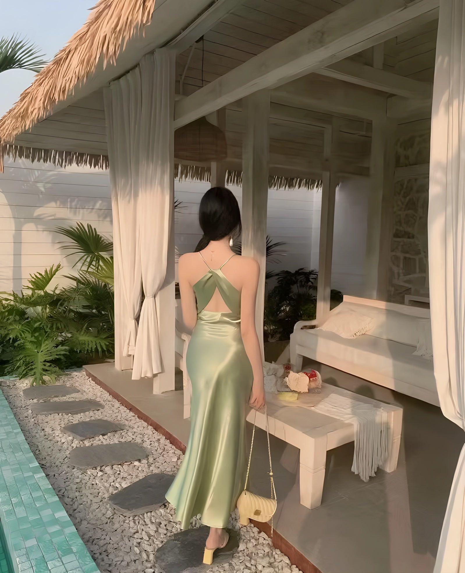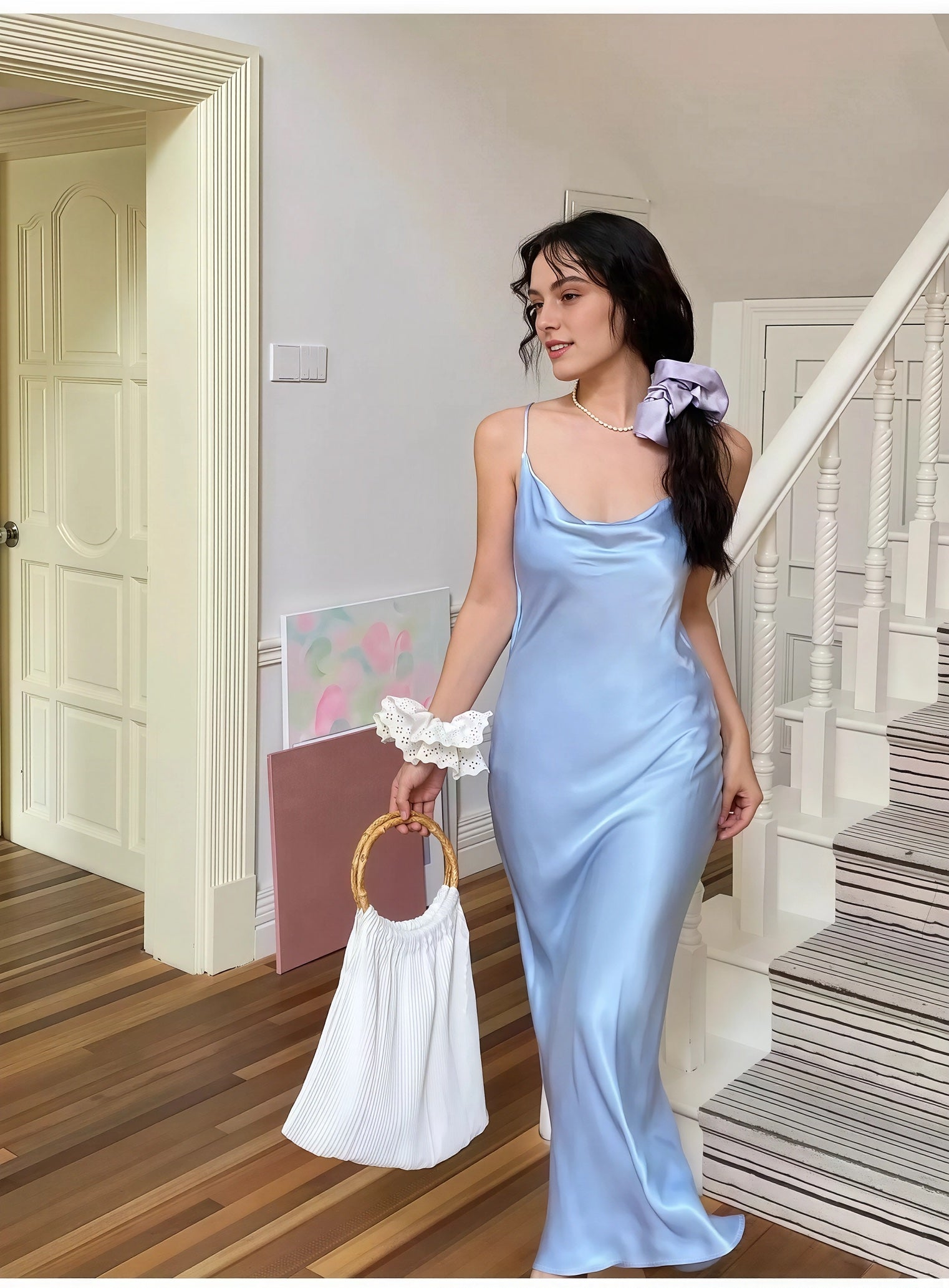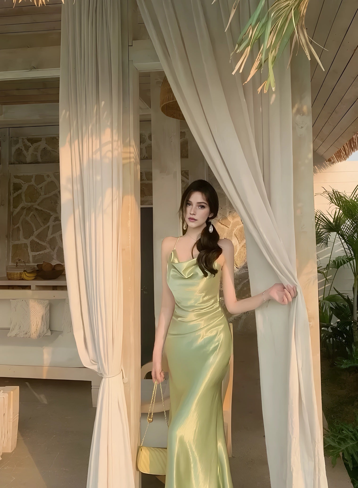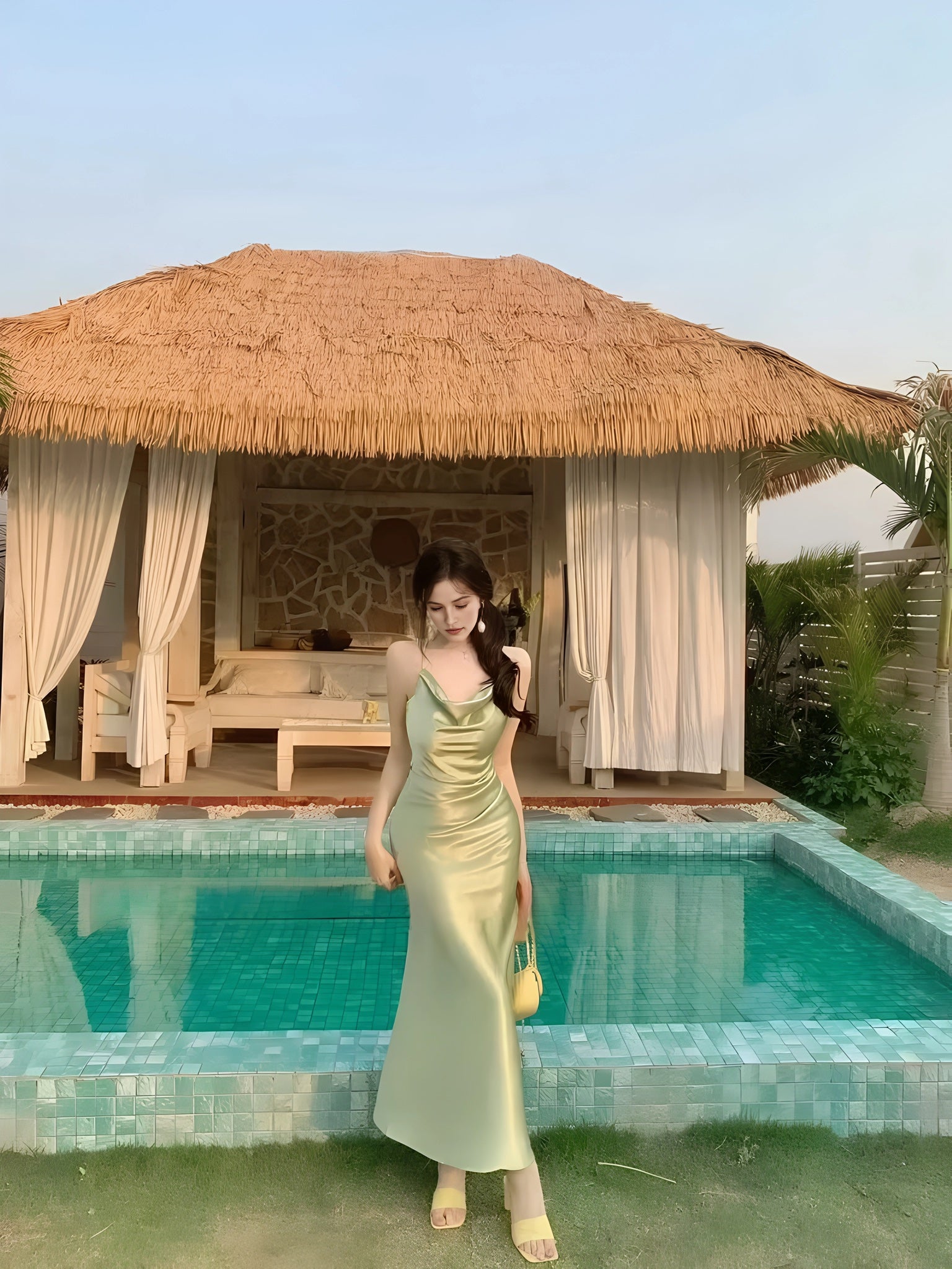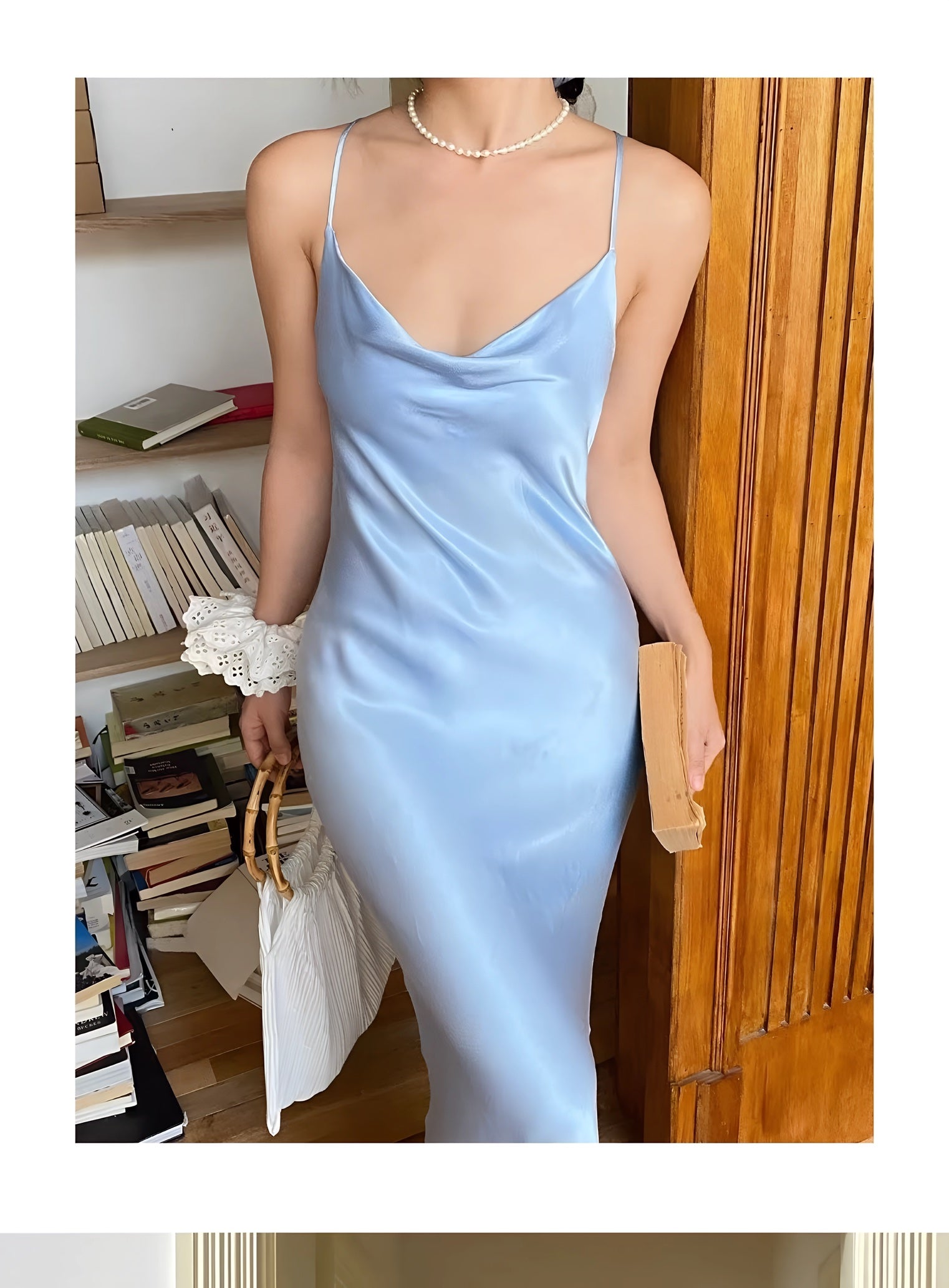 A satin slip gown featuring slender straps, a softly draped cowl neckline, and a long, fluid silhouette that cascades to the floor with natural ease. Its luminous finish shifts with the light, enhancing its tranquil elegance. Available in tones of sky blue and misty green, it is perfect for garden evenings, seaside dinners, or moments when one wishes to move like water itself.