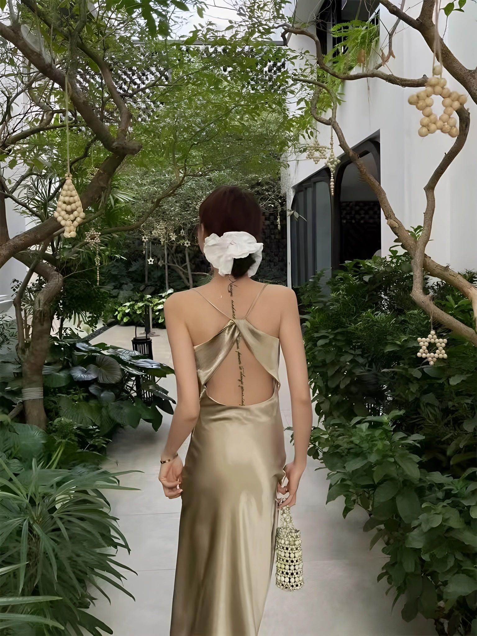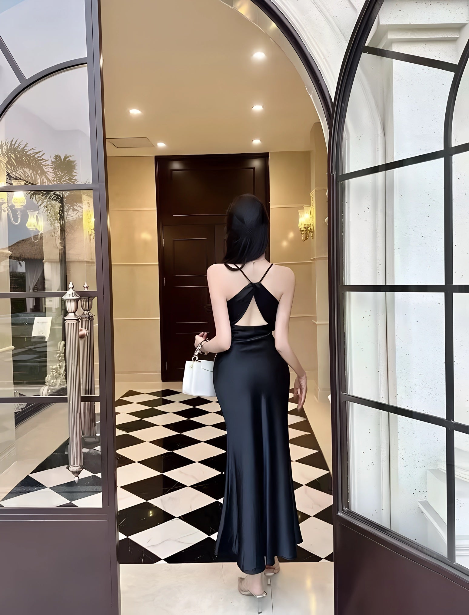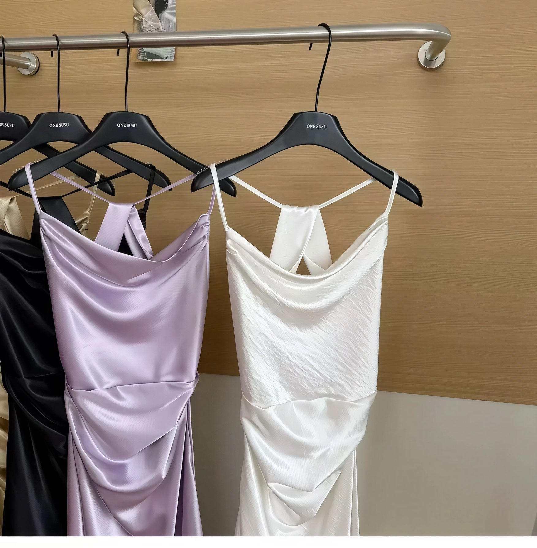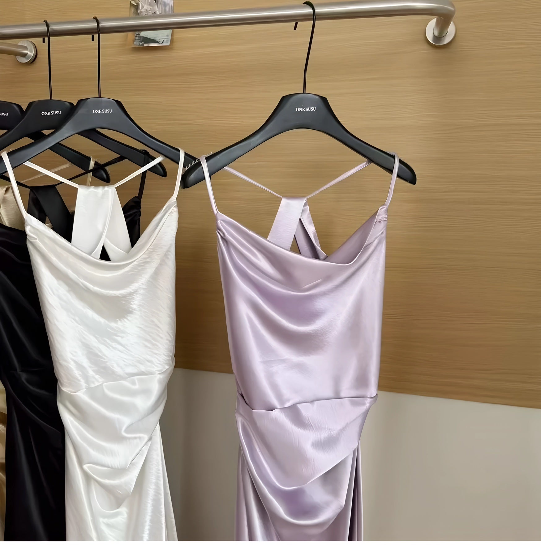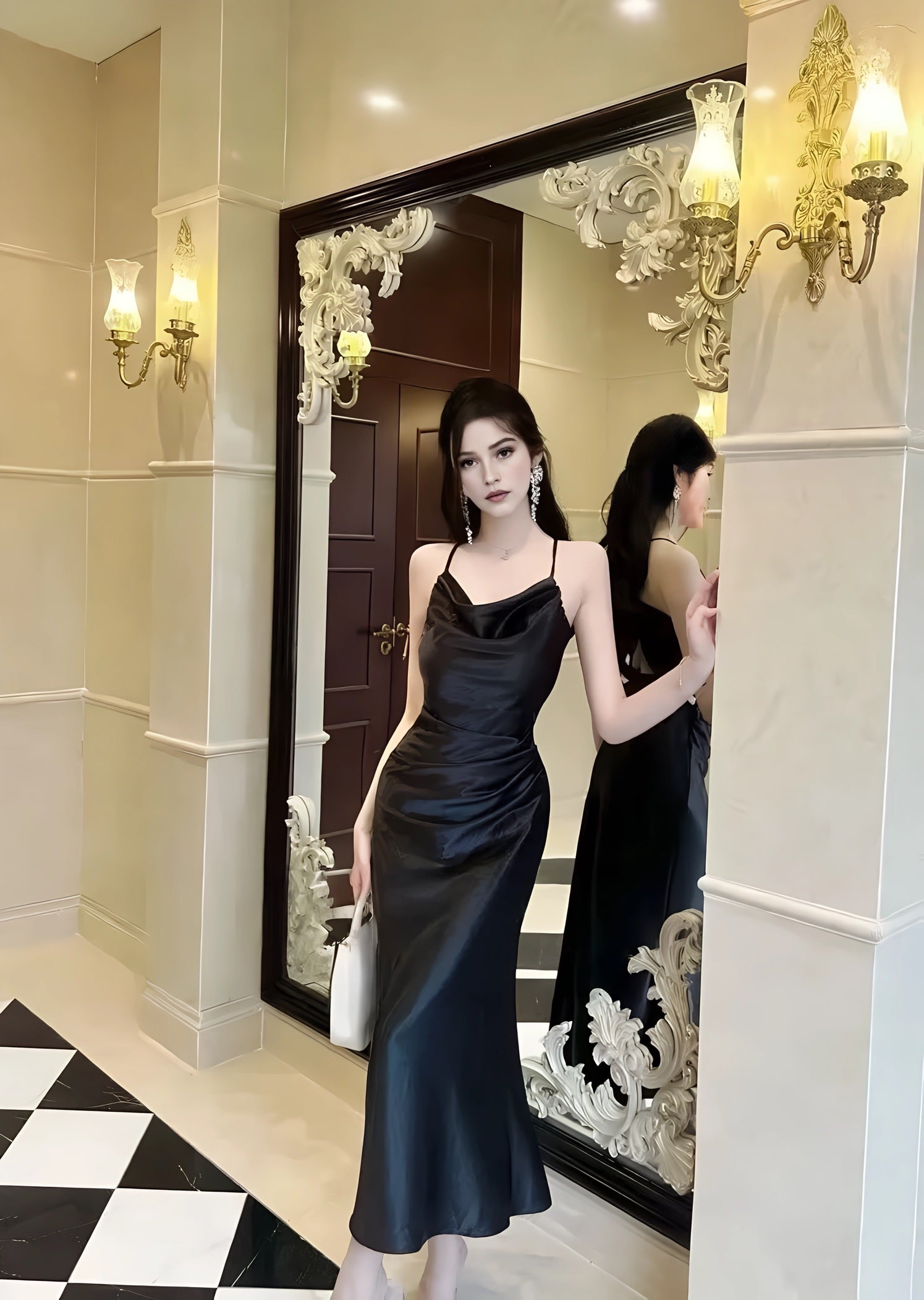 A satin slip gown featuring slender straps, a softly draped cowl neckline, and a long, fluid silhouette that cascades to the floor with natural ease. Its luminous finish shifts with the light, enhancing its tranquil elegance. Available in tones of sky blue and misty green, it is perfect for garden evenings, seaside dinners, or moments when one wishes to move like water itself.