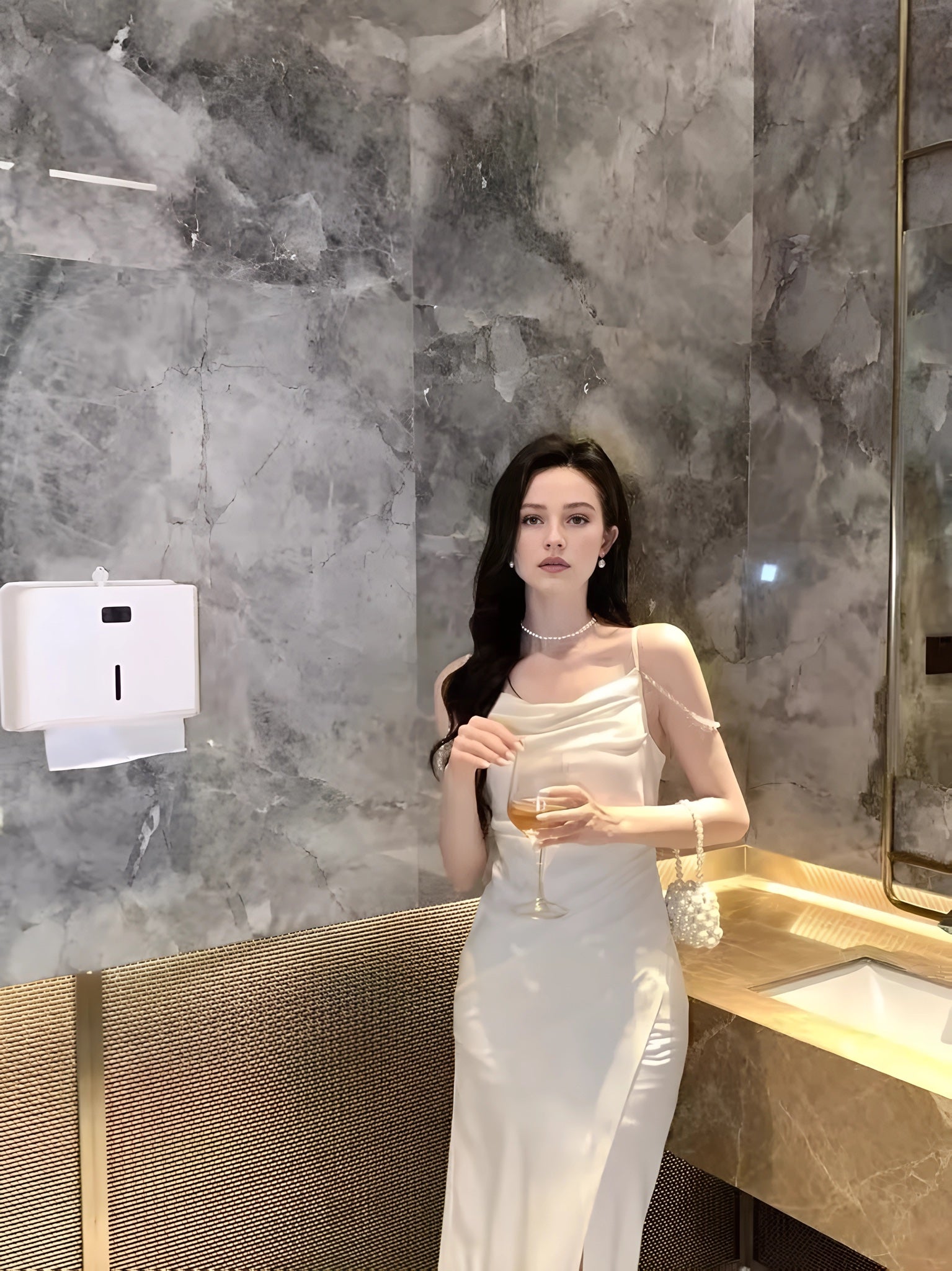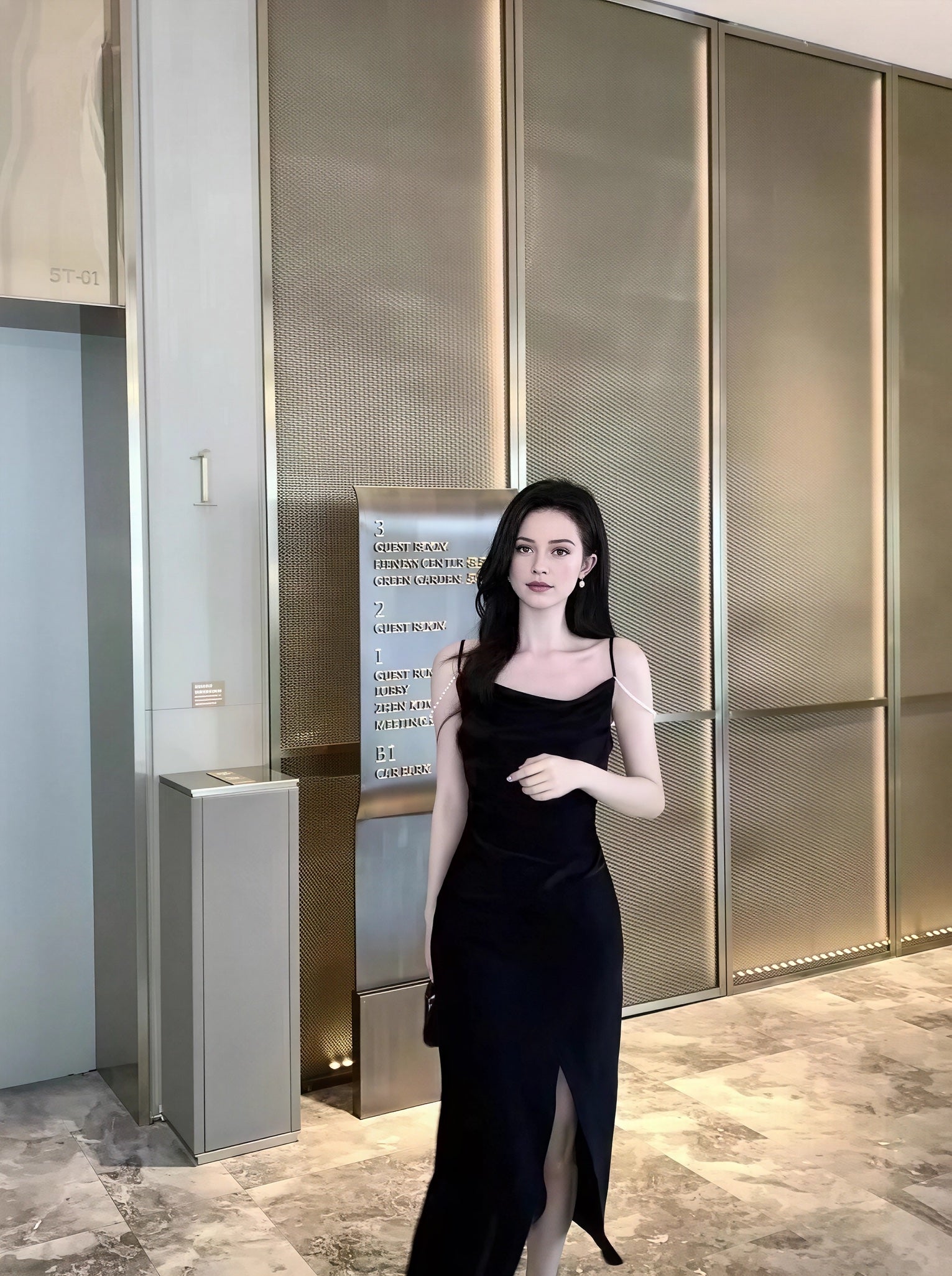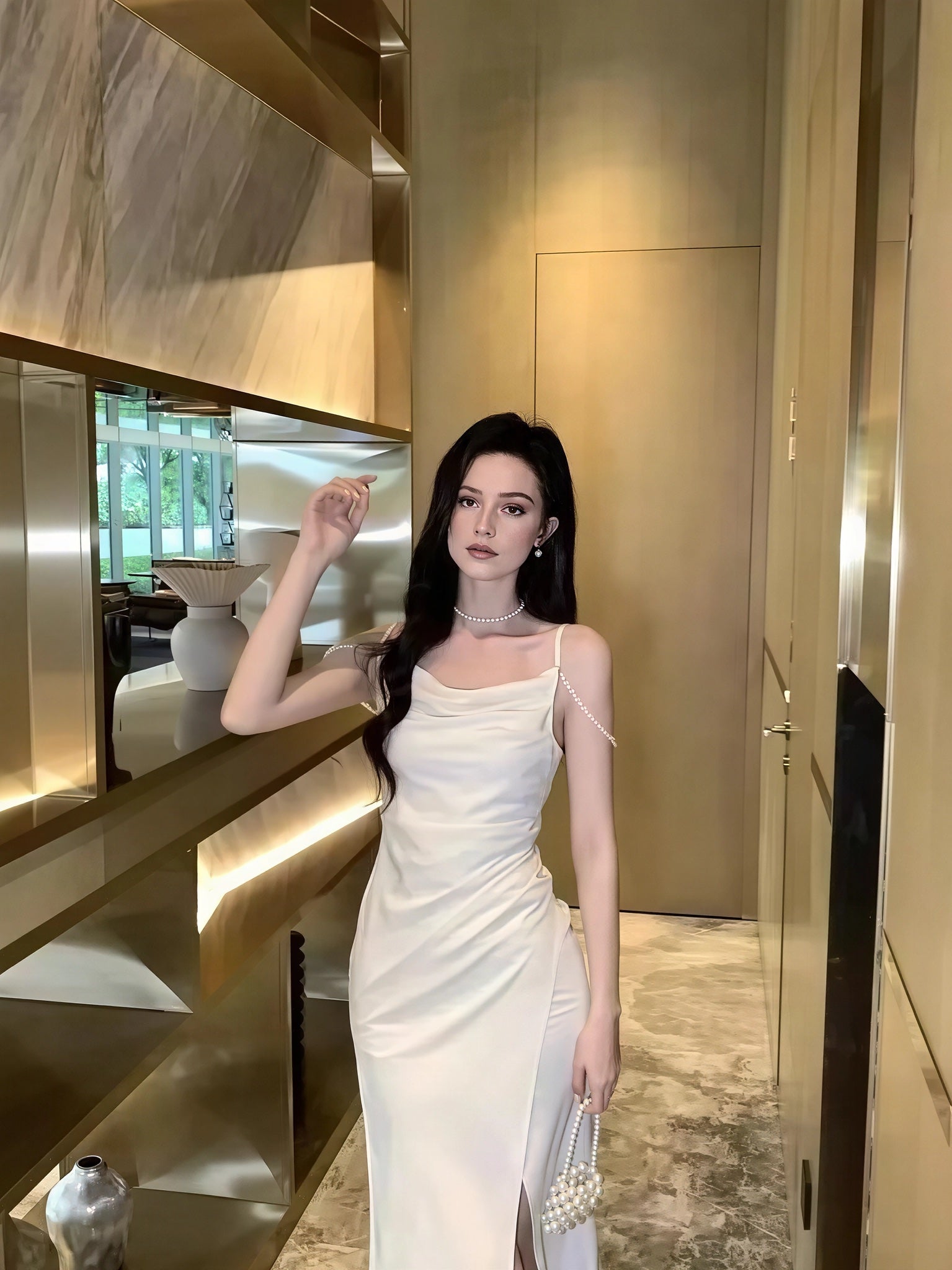 The Naomi Watts dress is modern refinement — understated yet radiant, with an effortless balance of poise and allure. Its asymmetrical neckline and delicate strap details create quiet drama, while its fitted satin silhouette speaks in clean, confident lines.