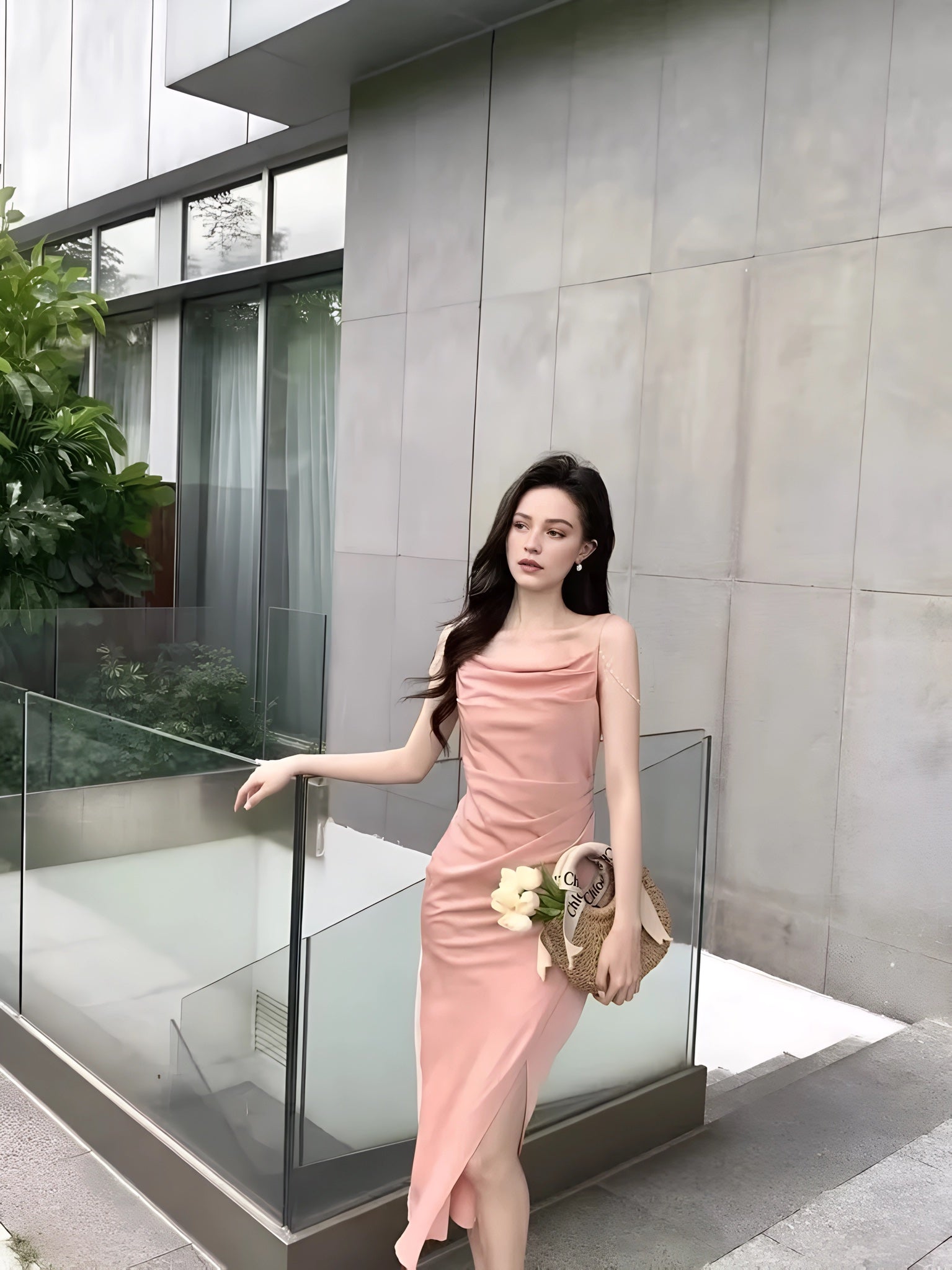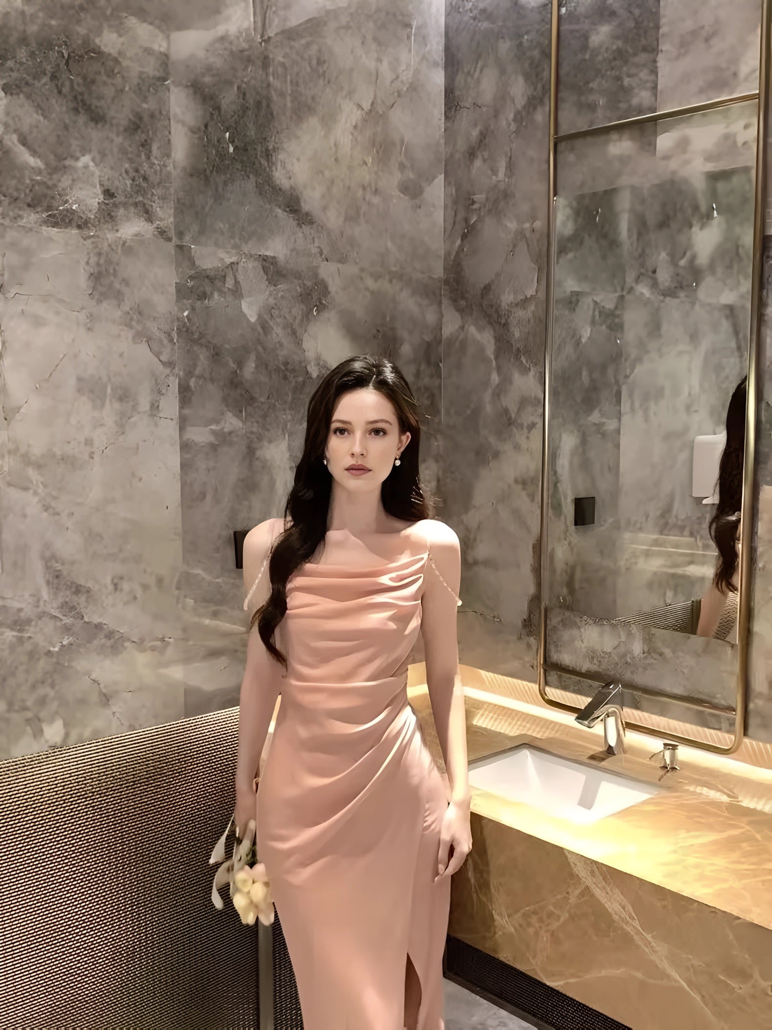 This gown features a one-shoulder neckline with draped detailing, a slim fitted waist, and a straight skirt with a subtle slit for movement. Elegant and minimal, it creates a look that is polished without excess. Available in black, pink, and cream, it is perfect for cocktail evenings, weddings, or occasions where modern elegance must shine with ease.