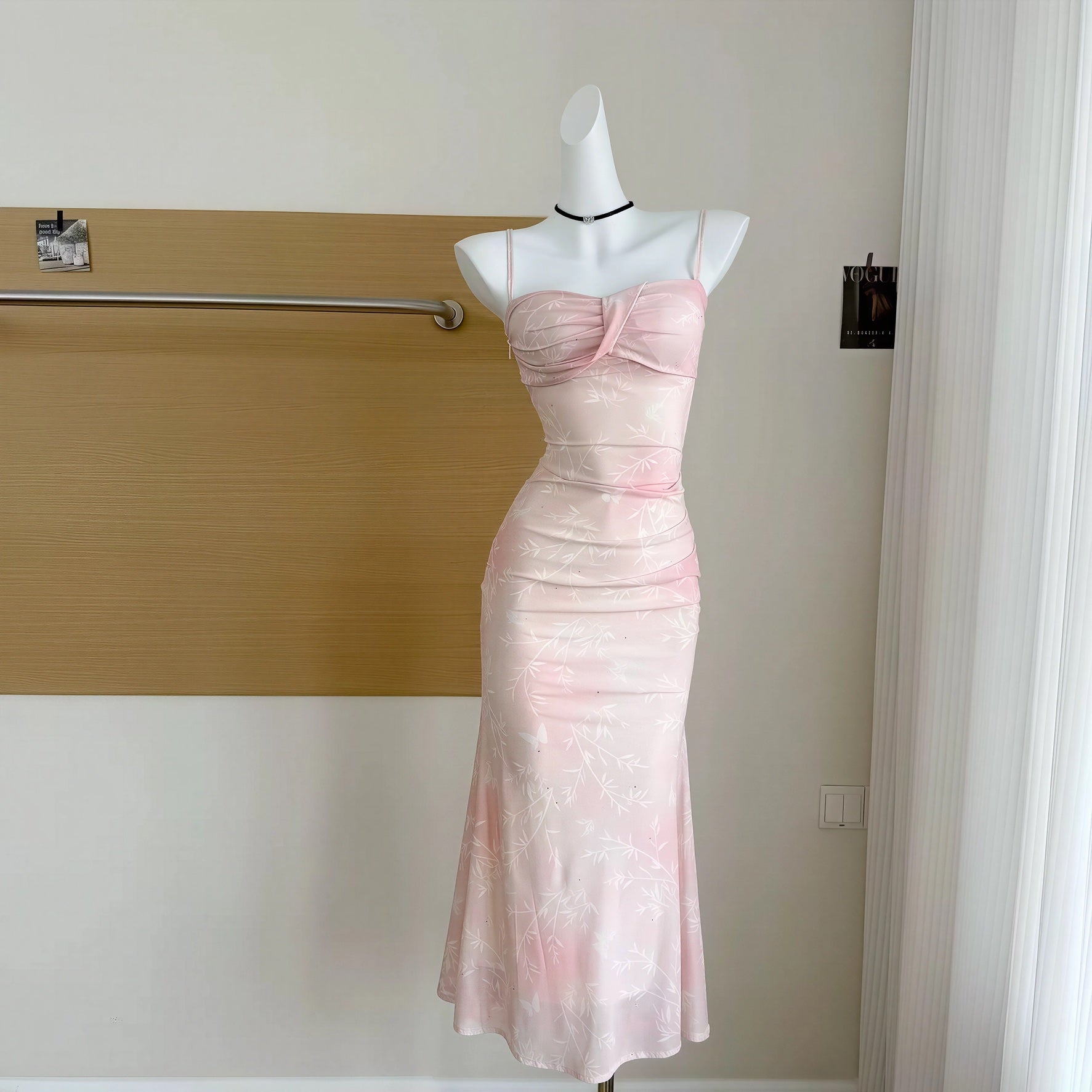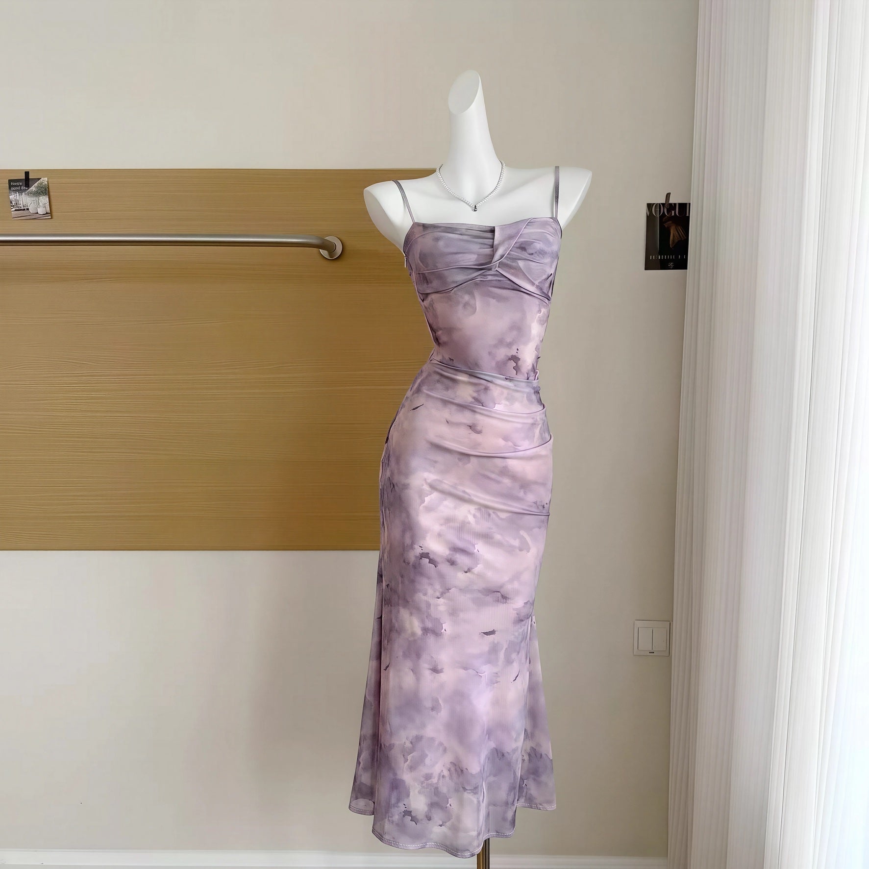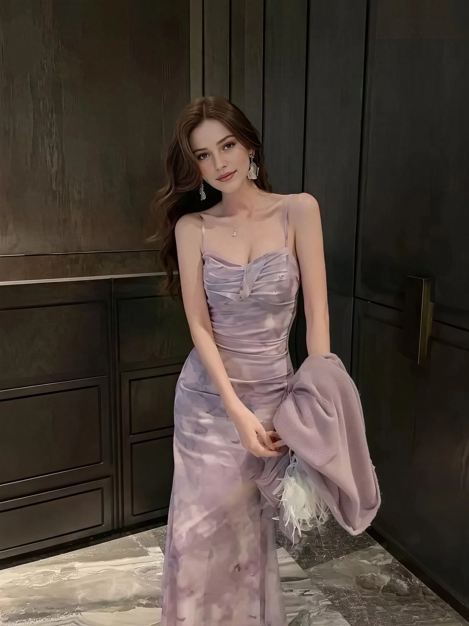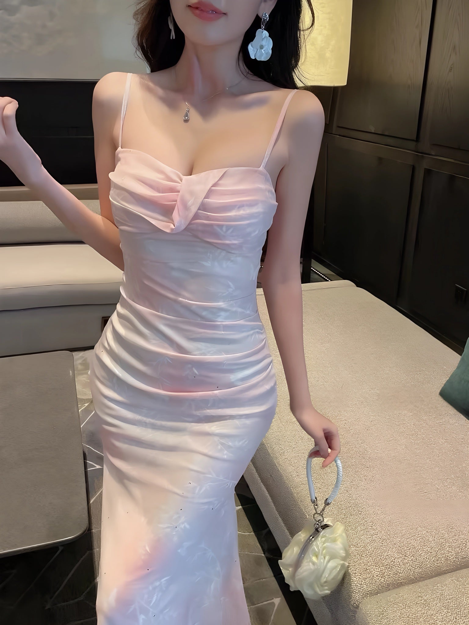This gown features slender spaghetti straps, a ruched sweetheart neckline, and a fitted silhouette that skims the figure before flowing into a gentle hem. Available in pastel shades like blush-pink and lavender, the gown’s subtle marbling effect gives it depth and movement. Suited for salons, soirées, or occasions where grace carries its own persuasion.