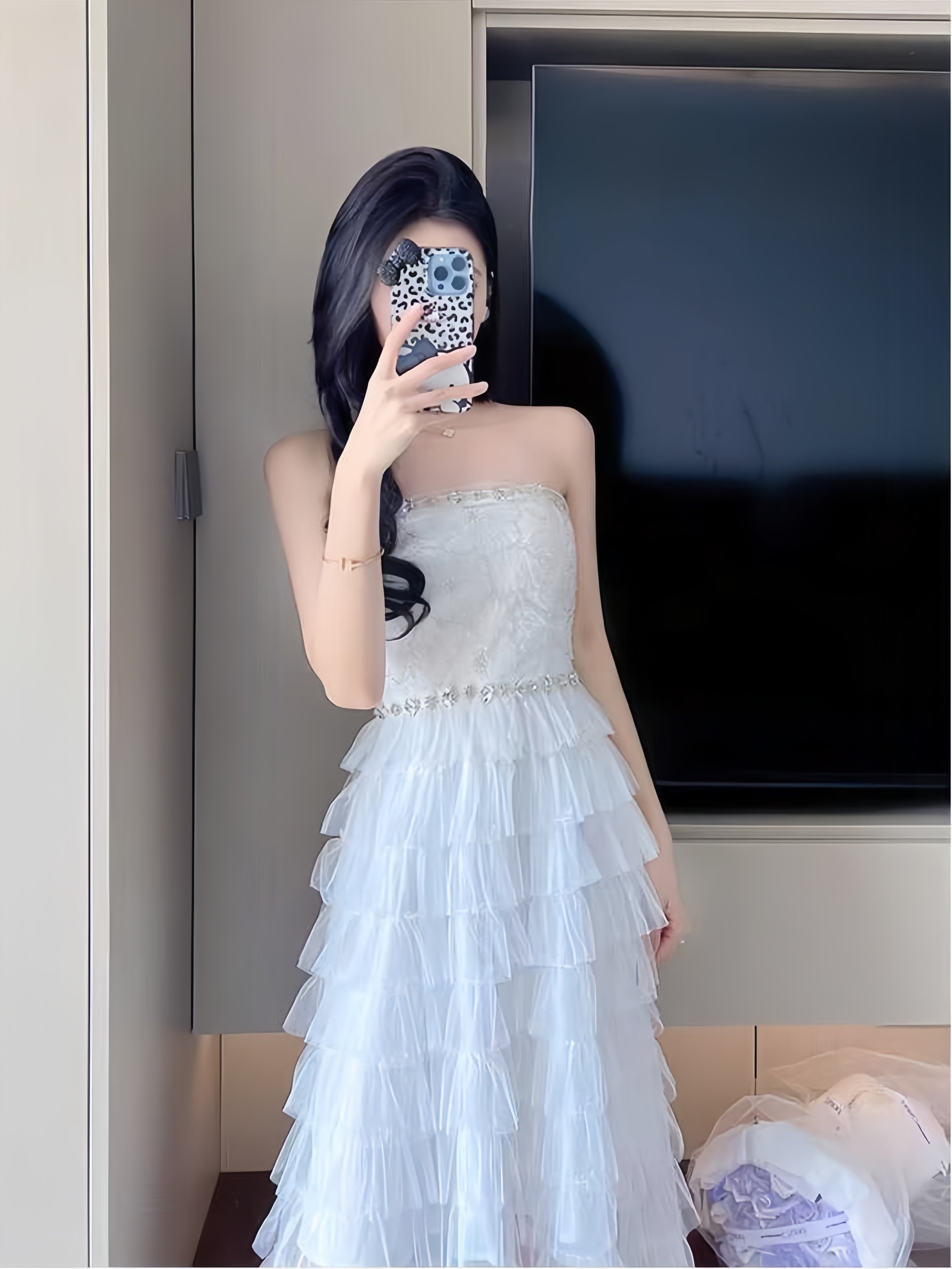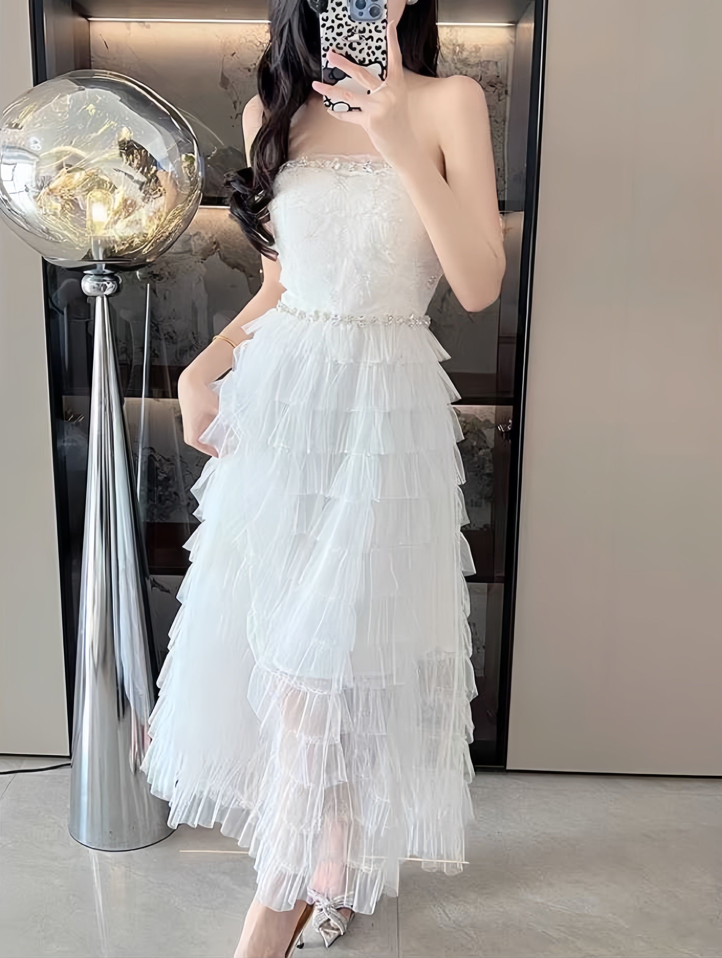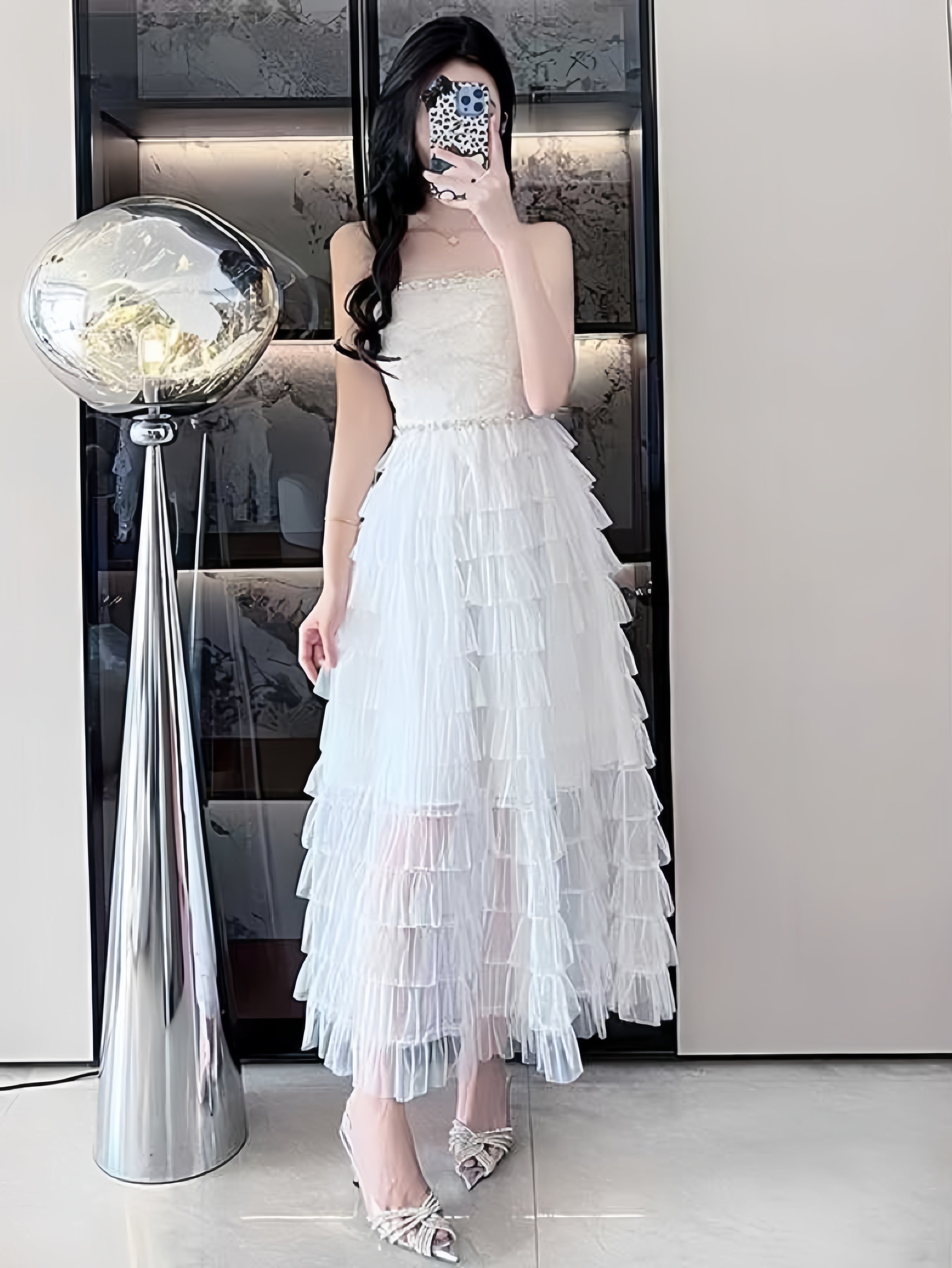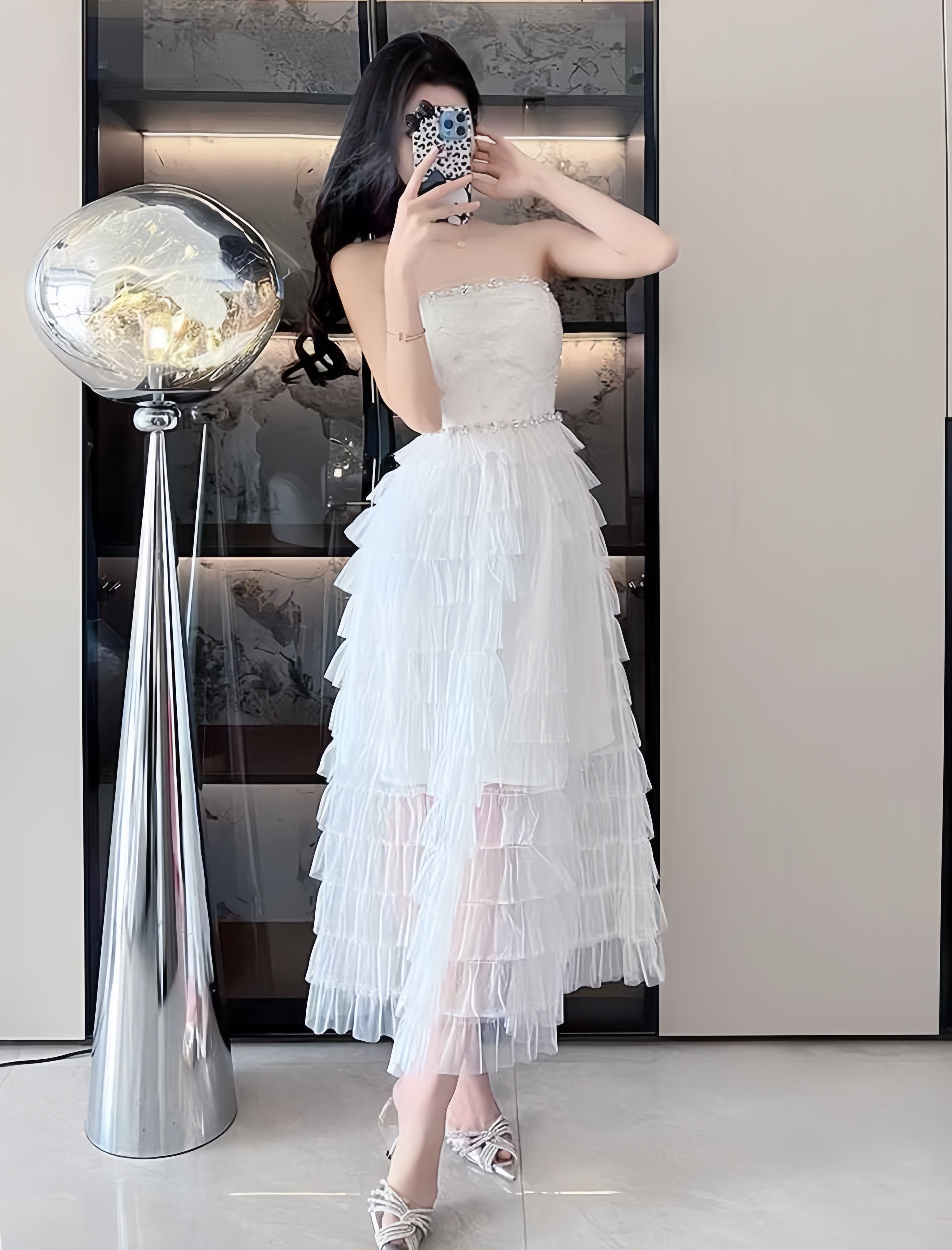 A strapless white tea-length gown with a lace bodice, delicately beaded neckline, and a crystal-accented waistline. The skirt is a poetic waterfall of soft tulle tiers, moving like whispers of clouds with each step. A dress that feels like stepping into a dream, perfect for garden soirées, engagement parties, or simply making an ordinary moment unforgettable.