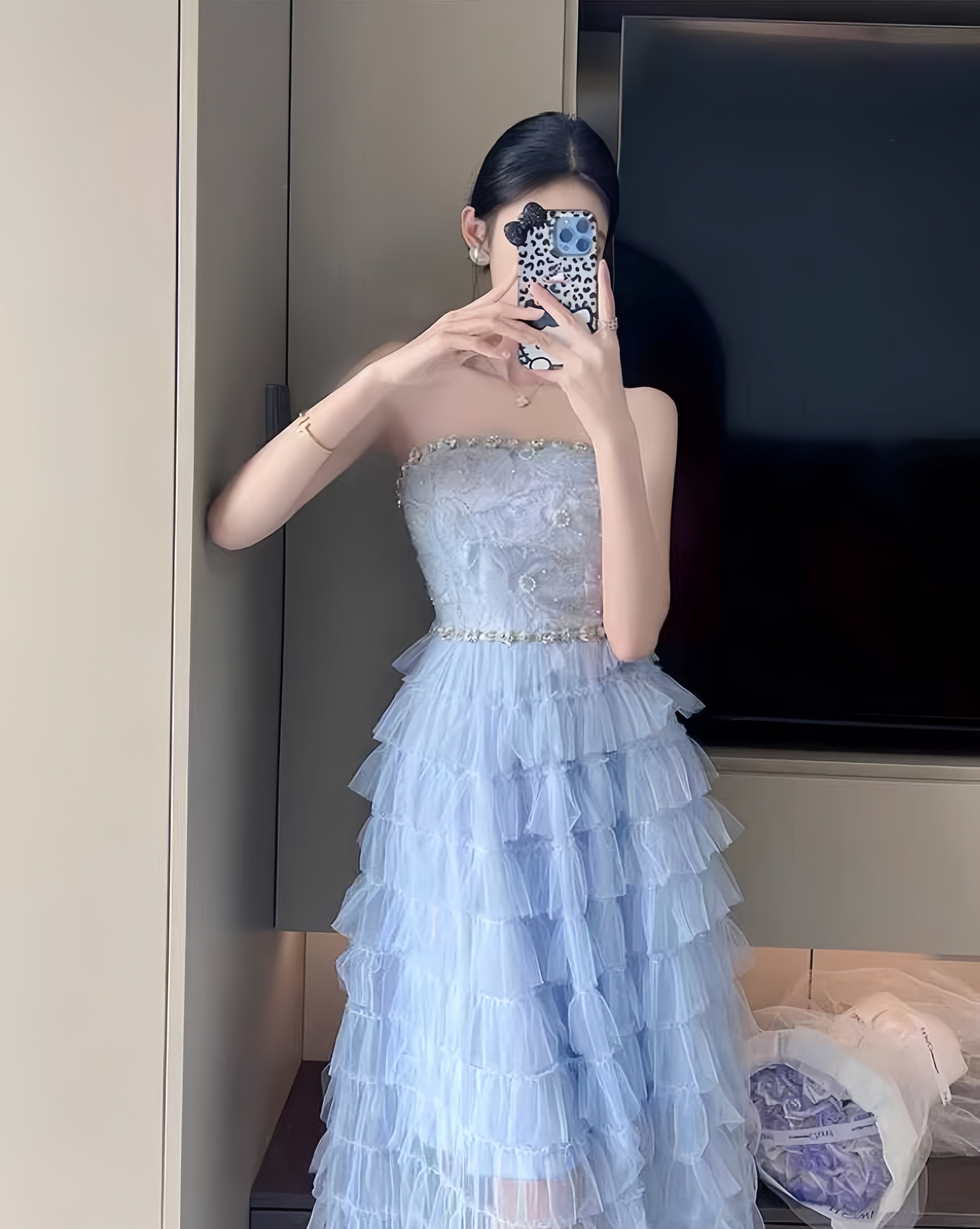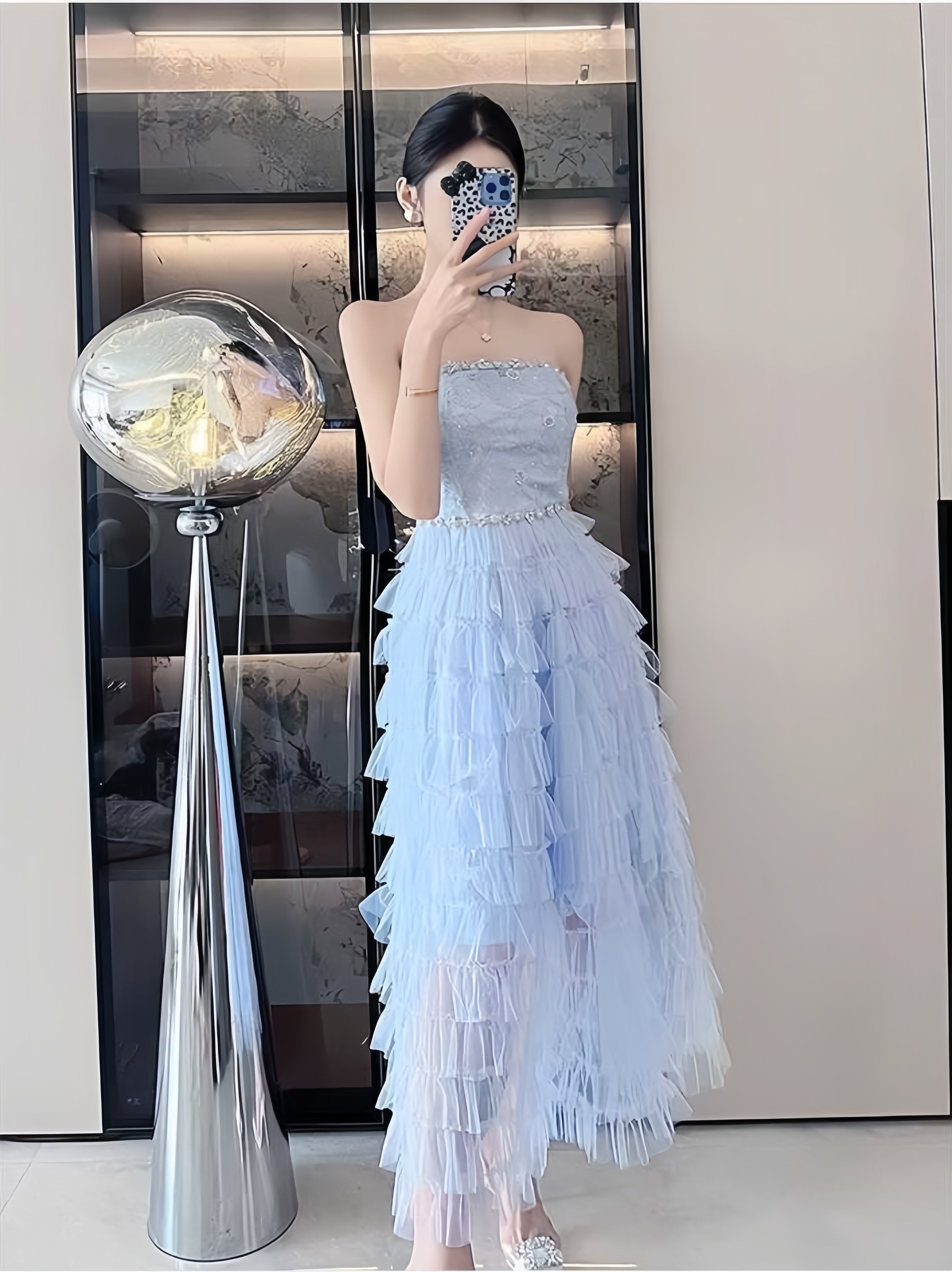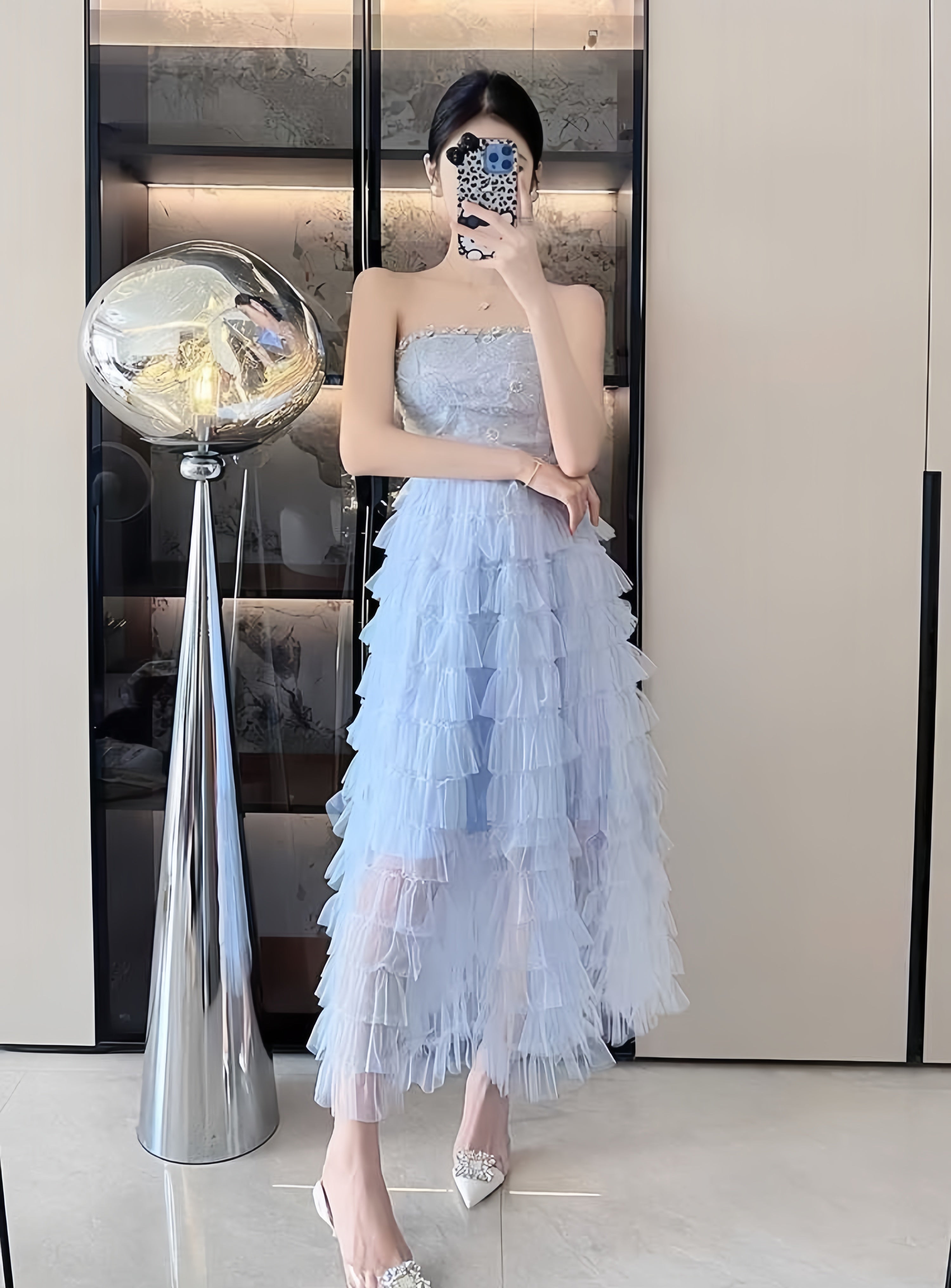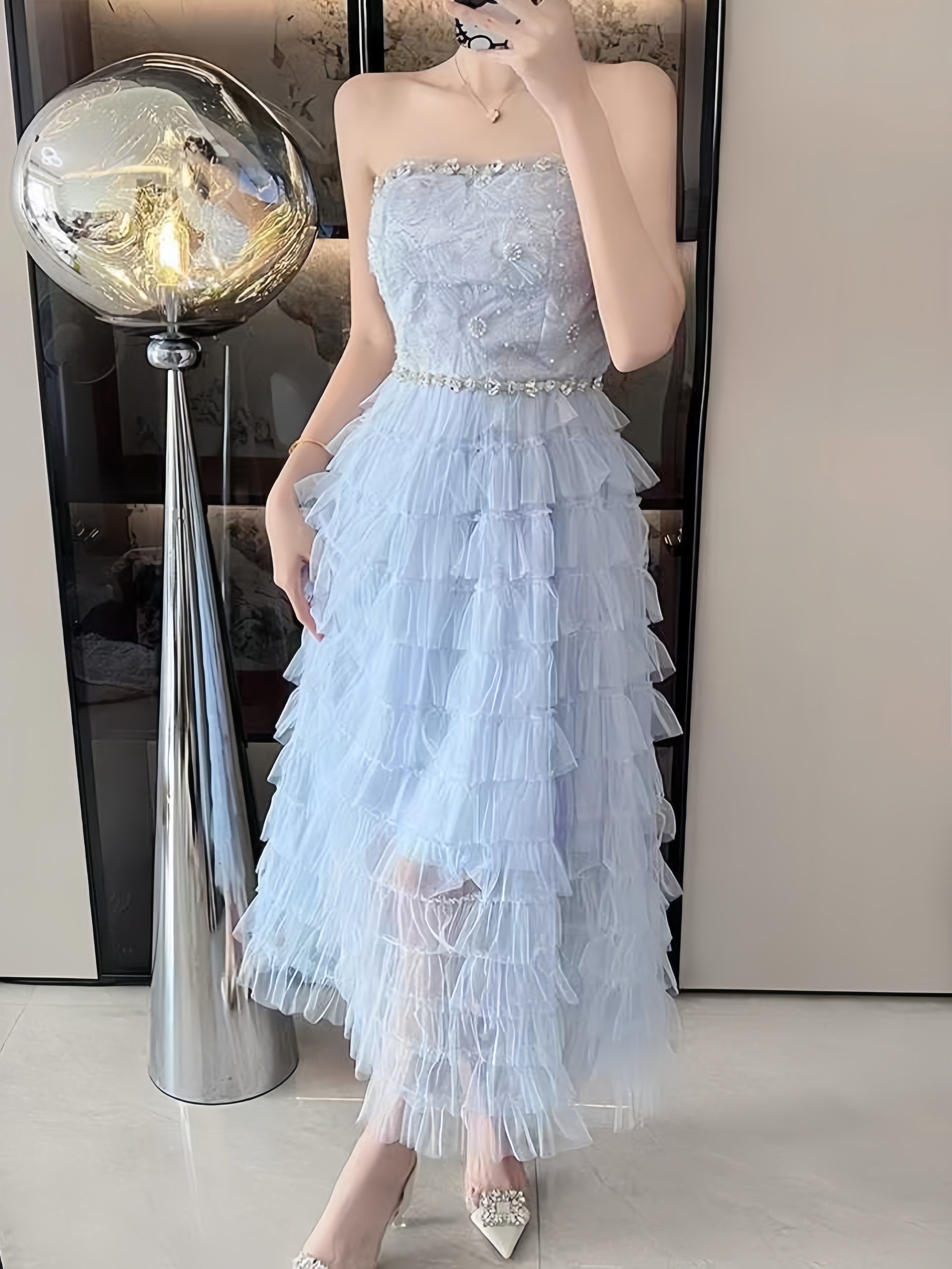 A strapless white tea-length gown with a lace bodice, delicately beaded neckline, and a crystal-accented waistline. The skirt is a poetic waterfall of soft tulle tiers, moving like whispers of clouds with each step. A dress that feels like stepping into a dream, perfect for garden soirées, engagement parties, or simply making an ordinary moment unforgettable.