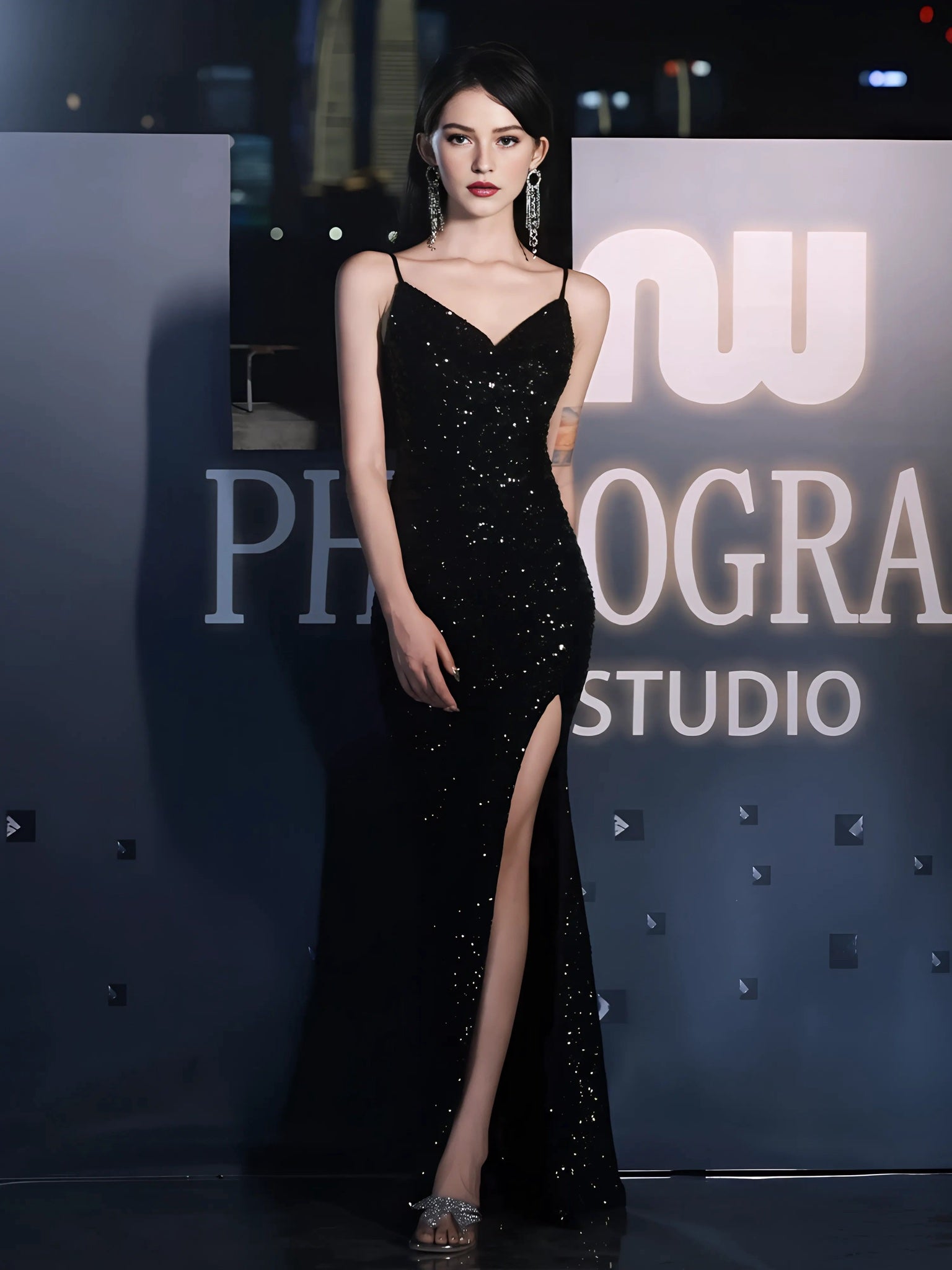 This strapless gown is crafted from gold sequins, cut to accentuate the waist and hips before falling into a thigh-high slit. Its fitted shape sculpts the figure while its brilliance reflects every flicker of light. Available in gold, royal metallic, white, and gray, it is designed for gala nights, stage-worthy entrances, or evenings when presence alone must electrify the room.