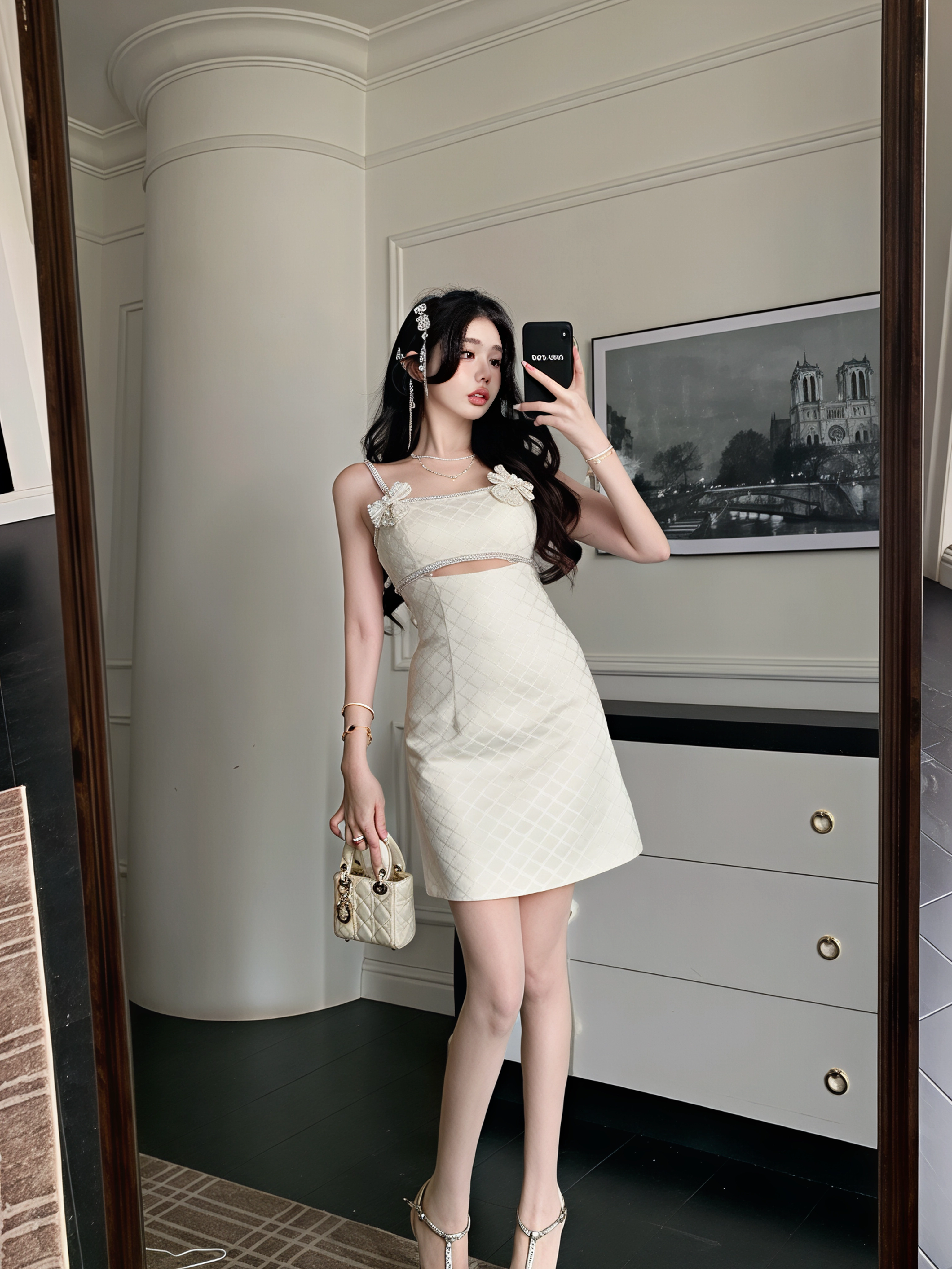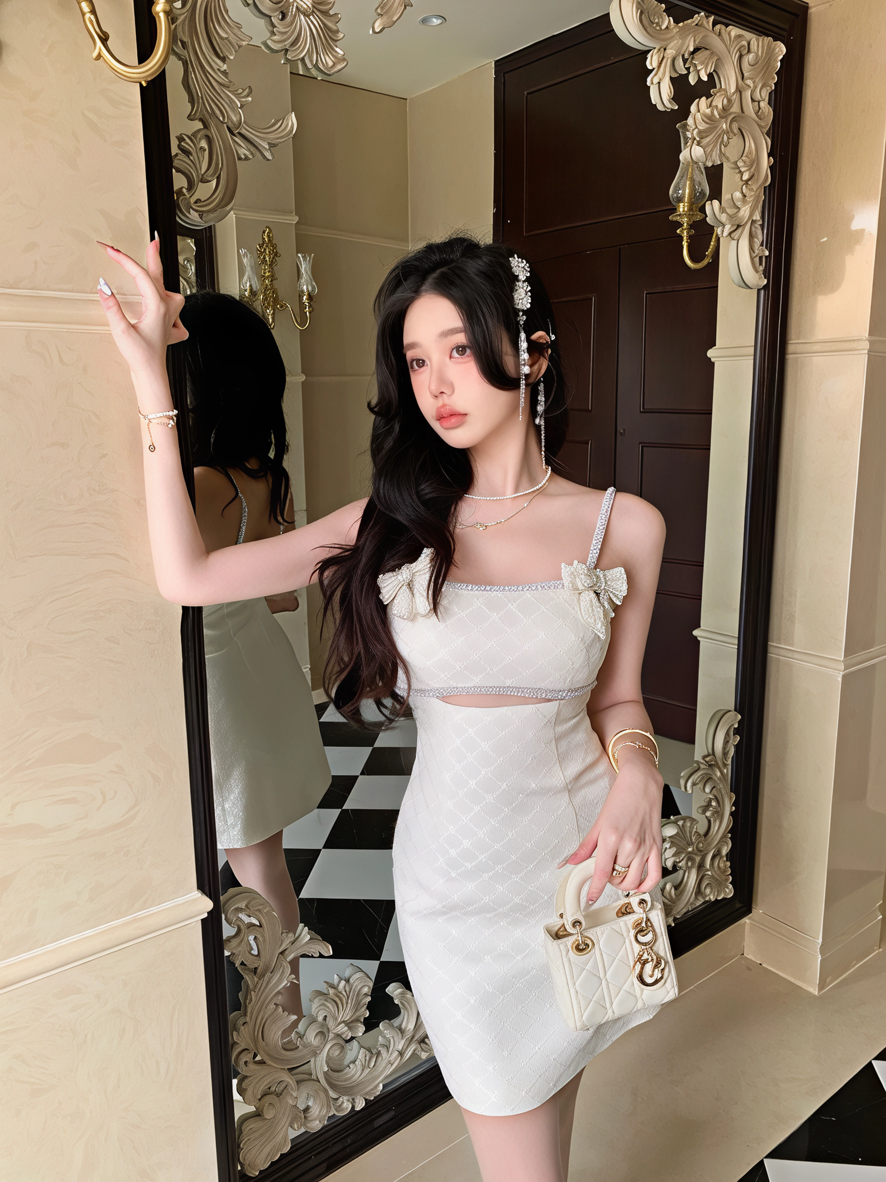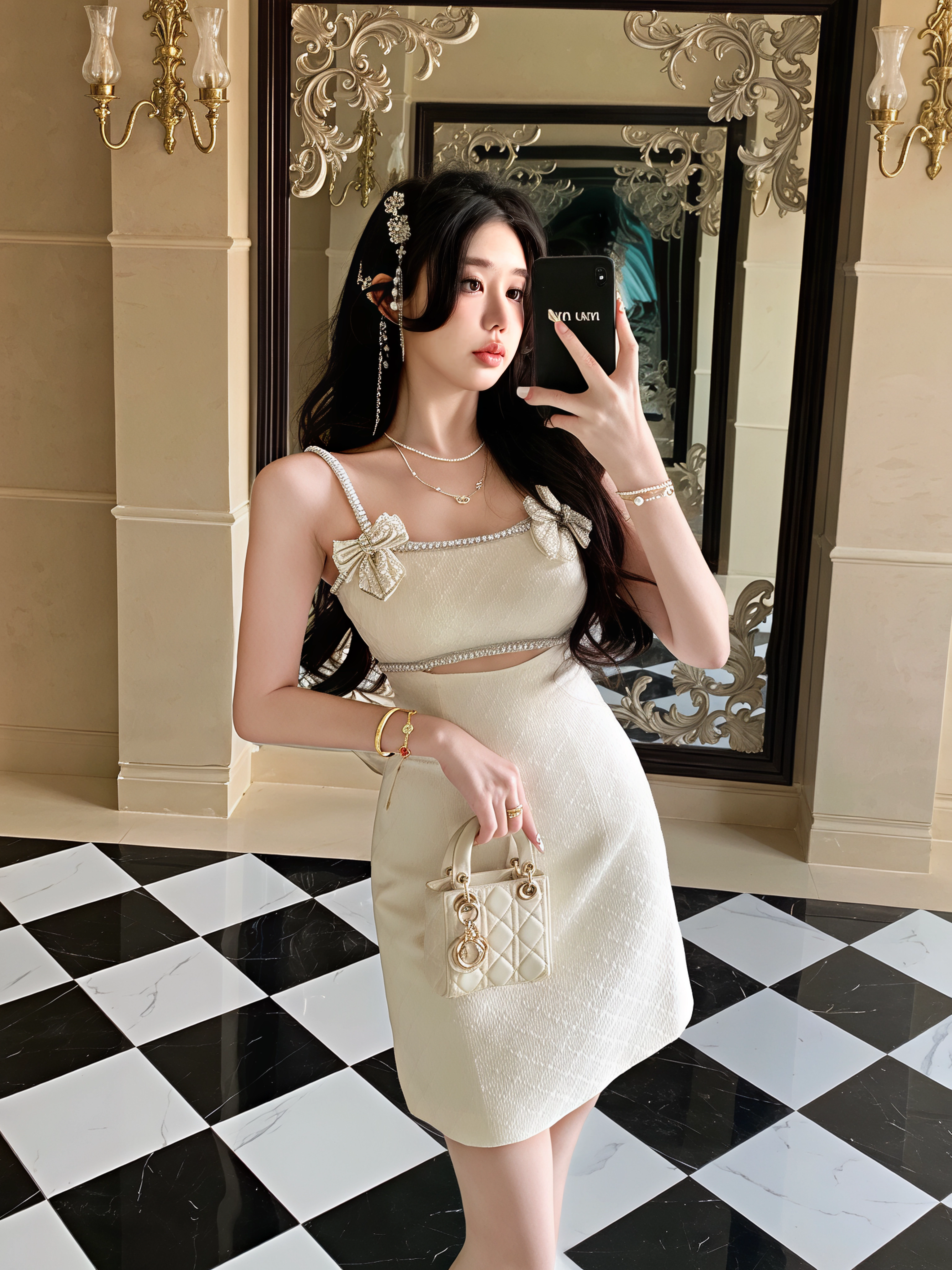 In shimmering ivory jacquard, this fitted silhouette is crowned with pearl-dusted bows at the shoulders, symbols of delicate strength. A subtle cut-out whispers rebellion against conformity, while its luminous finish captures light like a canvas alive with color. Playful yet sophisticated, it is the perfect companion for soirées, gallery nights, or any occasion where individuality is the most radiant accessory.