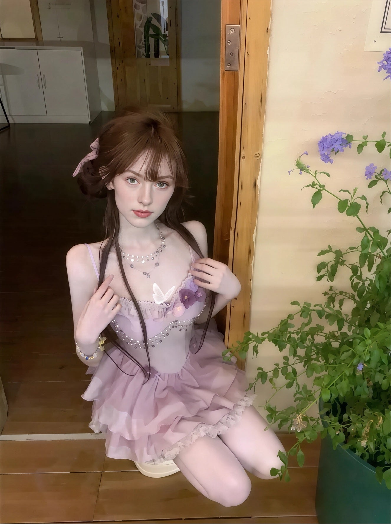 Dress Description: A dreamy lavender mini dress with layered tulle ruffles, soft floral accents, and hand-placed pearl details along the neckline. Light and airy yet structured enough to flatter, it’s a design that invites playfulness while exuding refinement — perfect for garden soirées, whimsical nights out, or any occasion where imagination meets elegance.